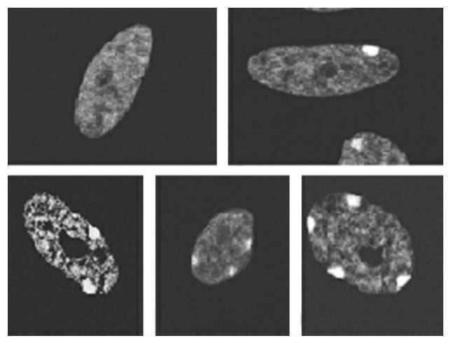 染色质是间期细胞核中伸展开的DNA蛋白质纤维。呈松散状的,染色浅而均匀的染色质称为常染色质(euchromatin)。常染色质中不含重复性DNA,多为结构基因的位置所在,具有转录活性。异染色质(heterochromatin)则指呈凝缩状的,染色较深,很少进行转录的染色质。一般而言,组成异染色质的DNA螺旋化程度比较高,因而可被碱性染料深染,这种现象称为正异固缩。当然,异染色质区域的正异固缩状态并不是一成不变的。在细胞周期的另一些时相中,异染色质又可表现为螺旋化程度较低而浅染,称为负异固缩。异染色质常被分为专性异染色质和兼性异染色质两种。前者由高度重复的DNA组成,没有转录活性,在间期核中始终处于异固缩状态,如着丝粒区,存在于生物的整个生命过程中;后者则在特定条件下,由常染色质转变而来,受发育控制。例如,人类女性2条X性染色体中的1条在细胞分裂的间期即处于异固缩状态,这一状态从受精卵形成后的第3天开始,约1周后完成,且维持终身不变。用硫堇或其他染料染色显示出1个直径为1μm大小的浓染小体,贴近核膜边缘,称为X染色质(X chromatin),也称X小体或Barr小体(Barr body),为正常女性体细胞所特有。在男性的XY性染色体中,Y染色体长臂远端的异染色质,在间期可用荧光染料染色显示出1个直径约0.3μm的强荧光小体,称为Y染色质(Y chromatin),也称Y小体,为正常男性体细胞所特有。因此,体细胞间期的性染色质可用于区别男女性别。