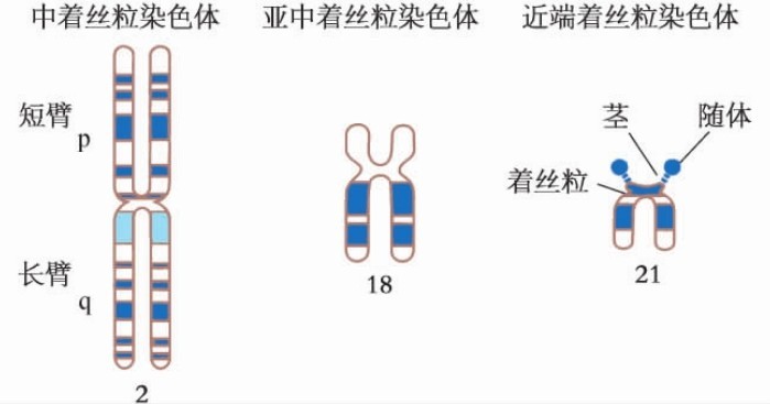 根据着丝粒的位置,人类染色体可分为3种:①中着丝粒染色体(metacentric chromosome),着丝粒位于或靠近染色体中央(染色体长度的1/2~5/8之间),将染色体分为长短相近的两个臂;②亚中着丝粒染色体(submetacentric chromosome),着丝粒偏向一端(5/8~7/8),将染色体分为长短明显不同的两个臂;③近端着丝粒染色体(acrocentric chromosome),着丝粒靠近一端(7/8~末端)。人类没有真正的端着丝粒染色体(见图10-2)。