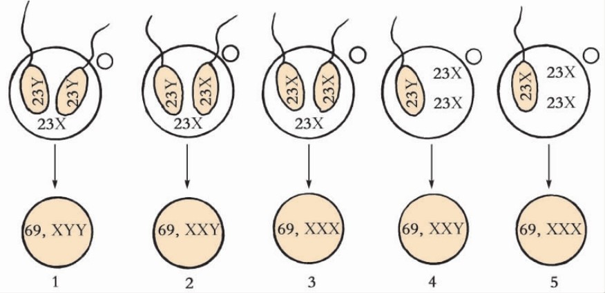 三倍体患者的体细胞具有3个染色体组,每对染色体都增加了1条,染色体总数为69 (3n)。一般认为三倍体形成的机制主要是由于:①双雄受精(diandry):2个精子同时进入1个成熟的卵细胞受精,形成三倍体合子。即可形成69,XXY;69,XXX和69,XYY 3种类型的受精卵。②双雌受精(digyny):在减数分裂时,卵细胞因某种原因未能形成极体,或第二极体与卵核重新结合,因而卵细胞中保留有2组染色体,受精后则形成三倍体合子(图11-1)。这一机制的可能性较大。