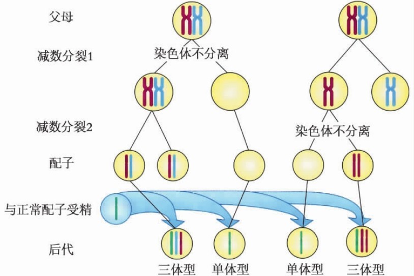 图11-2 两种合子(单体型和三体型)起源于配子形成中的染色体不分离而产生的三体型和单体型合子