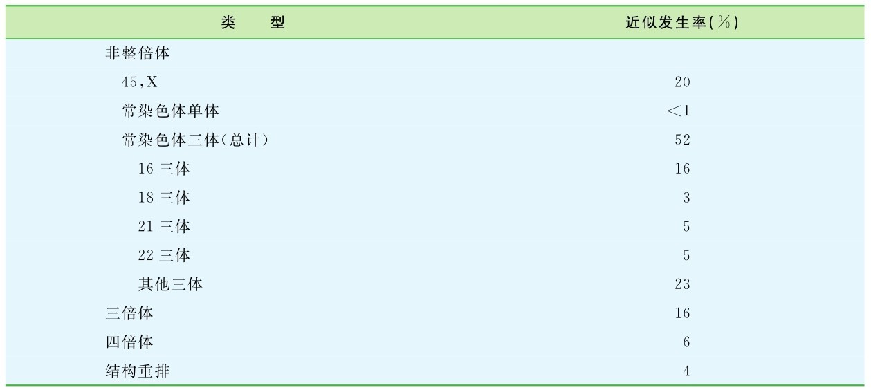 自发流产胎儿中约50%为染色体异常所致,其各类染色体异常的频率与活产新生儿不同(见表12-2~表12-4)。自发流产胎儿中三倍体和四倍体占20%,并不少见,但在新生儿中极罕见,5万余例新生儿中仅见1例三倍体,未见四倍体。流产胎儿中以45,X最为常见,占18%~20%,但在新生儿中仅占0.6%;其他性染色体异常(三体型)在新生儿中相当常见,16三体在流产胎儿中最常见,但在新生儿中尚未见。