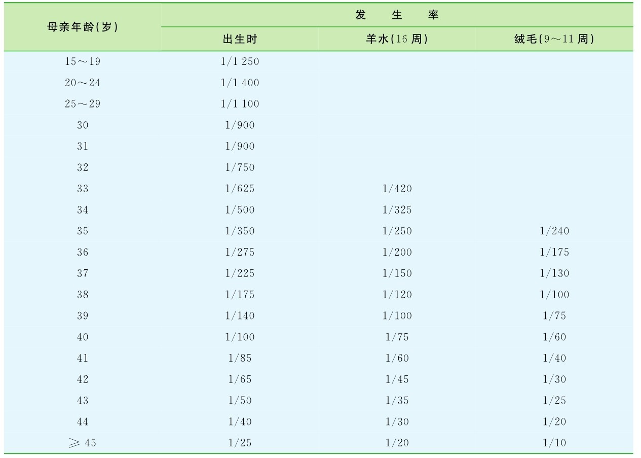 表12-5 新生儿(活)与胎儿21三体型发生率与母亲年龄的关系