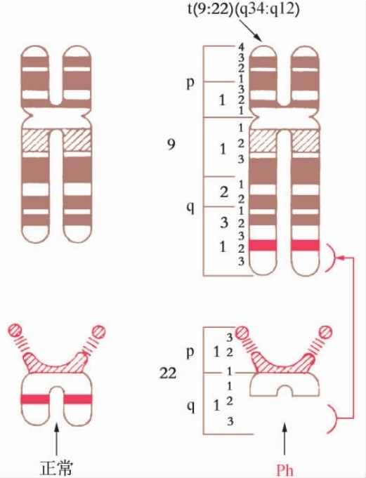 特异性标记染色体是指经常出现于同一种肿瘤内的标记染色体。比较突出的例子是CML中的费城染色体(Philadelphia chromosome),即Ph小体。Ph小体是第22号染色体长臂缺失所形成的畸变染色体,其断裂段易位于9号染色体长臂末端(图13-2)。CML患者中95%为Ph阳性,且发现于CML早期患者的骨髓细胞中,故有早期诊断的价值。据报道,化疗后Ph小体可消失。因此,Ph小体的有无又可作为判定治疗效果的一种指标。