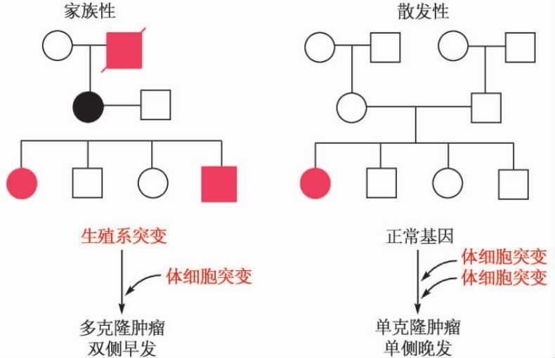 图13-4 家族性肿瘤与散发性肿瘤的比较及二次突变假说的解释