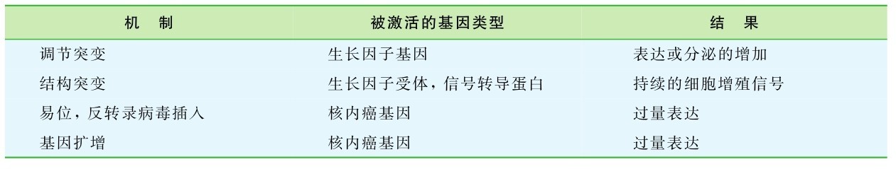 1.基因突变 早期的一个重要发现是对从膀胱癌细胞系的ras癌基因的分析得来的:癌基因与对应的原癌基因仅有一个碱基的差异,即第12位密码子GGC突变为GTC,使甘氨酸变为缬氨酸,这种肿瘤体细胞中的点突变产生了能刺激细胞发生转化的异常蛋白。癌基因在细胞水平呈显性,一个等位基因的突变足以使正常细胞发生恶变。Ras蛋白是一种位于细胞膜内部,存在于细胞膜上的信号转导蛋白。当它被细胞外因子激活时,便会从GDP状态变为有活性的GTP状态,产生刺激细胞生长的信号。而突变的Ras蛋白始终处于被激活的GTP活性状态。现已在许多肿瘤中发现了ras基因的点突变。