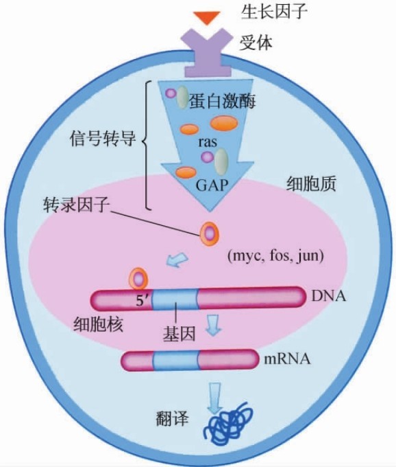 当细胞的生长与分化失去了控制即形成了肿瘤。现已发现近100个肿瘤相关基因(cancer-causing gene),或简称肿瘤基因(cancer gene),它们编码了参与调节细胞生长与分化的关键蛋白。关于这些蛋白在细胞的生长与分化中的功能及其交互作用的研究越来越深入,也奠定了肿瘤发生机制研究的基础(图13-3)。这些基因首先编码了调节(其他)细胞生长与分化的生长因子(growth factor),如血小板源生长因子(platelet-derived growth factor,PDGF)、表皮生长因子(epidermal growth factor,EGF);生长因子与细胞表面的生长因子受体(growth factor receptor)特异结合,启动细胞内的信号转导(signal transduction)过程,包括激活一些蛋白激酶(protein kinase),如src酪氨酸激酶(src tyrosine kinase)、丝裂素活化蛋白(mitogen-activated protein kinase,MAPK)和Jun K等;激酶通过调控靶蛋白,调节细胞的生长与分化相关基因的表达,进一步调节细胞的行为。