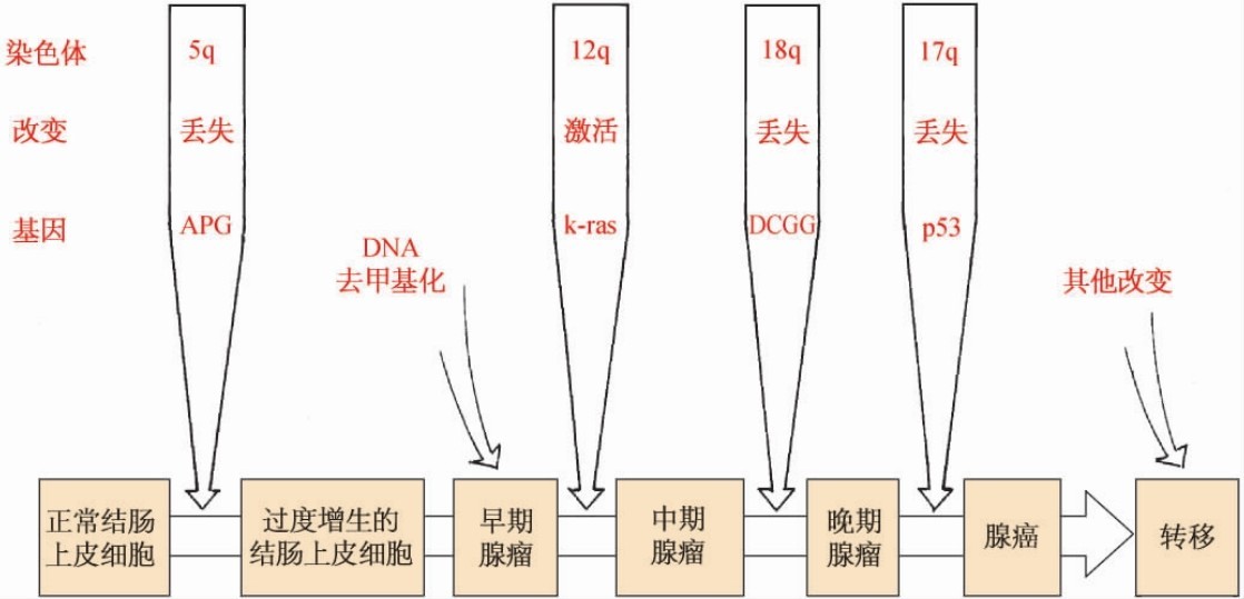 图13-5 结肠癌多步骤发生及相关基因改变的模式图