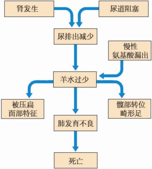 1.序列征 序列征(sequence)是指由单个因素引发的级联反应(cascade)而导致的单一器官缺陷。如在Potter序列征(Potter sequence)发生中,羊水的慢性渗漏或胎儿尿液排出缺陷使羊水过少(oligohydramnios),这导致胎儿压迫(fetal compression),表现为被压扁的面部特征(squashed facial features)、髋部转位、畸形脚、肺发育不全(pulmonary hypoplasia),新生儿常死于呼吸衰竭(图14-2)。