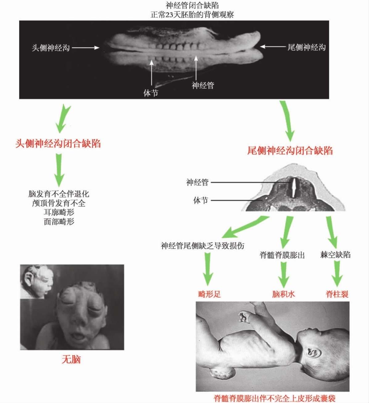 在胚胎发育的第4周,中枢神经系统形成一个与表面外胚层脱离的、关闭的、位于胚体背部中轴线上的神经管。神经管的头部发育增大形成脑,其余部分仍保持管状,形成脊髓。如果由于某种原因神经沟未能关闭,神经组织就依然露在外面,这样的缺损可长达胚胎身体的全长,也可以只局限于一小区域,通常称为开放性神经管缺陷。如果局限于脊髓的部分,这种异常通常就称为脊髓裂(myeloschisis),而头端部分的未关闭则称为无脑儿(anencephaly)。脊髓裂必然合并脊柱裂(spina bifida)。无脑儿和各种类型的脊柱裂是常见的神经管缺陷畸形(图14-3),其他为裸脑、脑膨出和脑积水等。