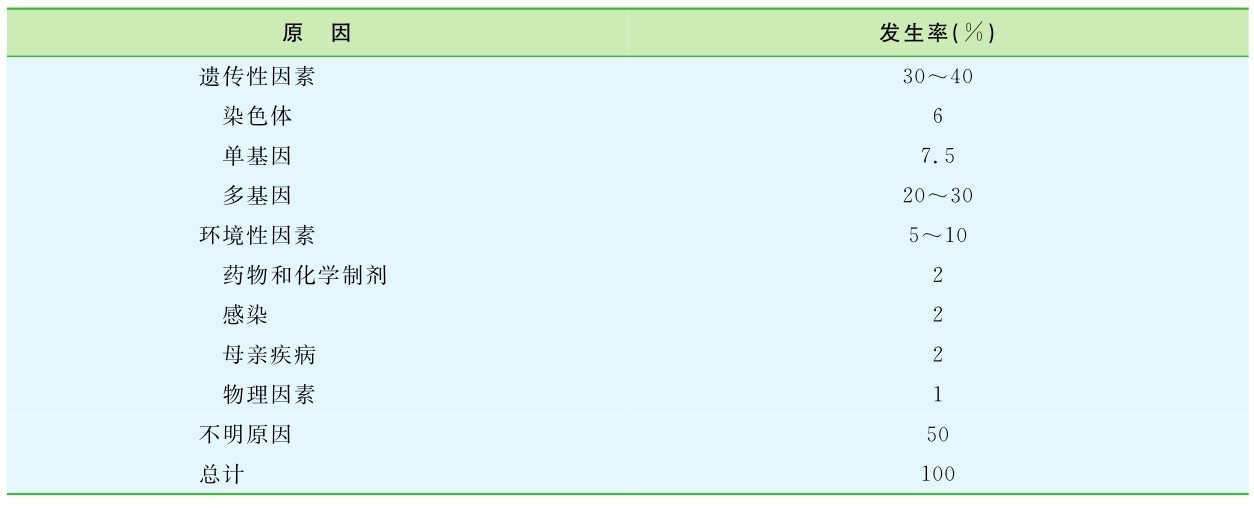 许多先天畸形的原因已经明确,但还有多达50%的先天畸形尚不清楚其原因。遗传因素引起的出生缺陷包括染色体畸变及单基因突变(表14-3)。