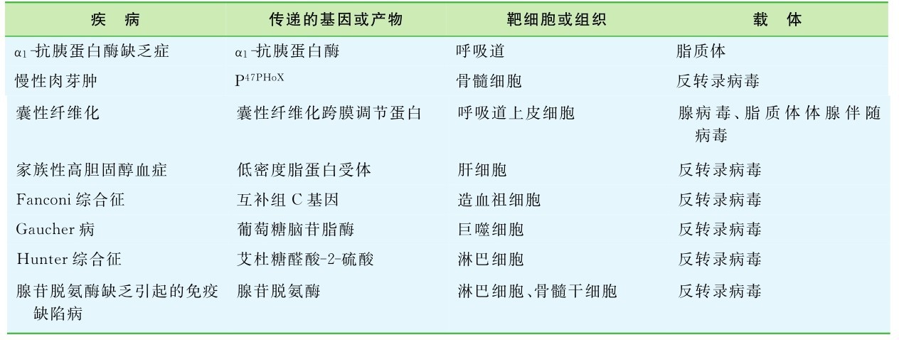 适于基因治疗的遗传病包括常被选择的并已经在临床上经过基因治疗获得疗效的少数几种疾病,如ADA、血友病B、家族性高胆固醇血症和囊性纤维变性等,以及一类作为基因治疗的候选疾病,如PKU、半乳糖血症、Gaucher病、α1-抗胰蛋白酶缺乏症等。