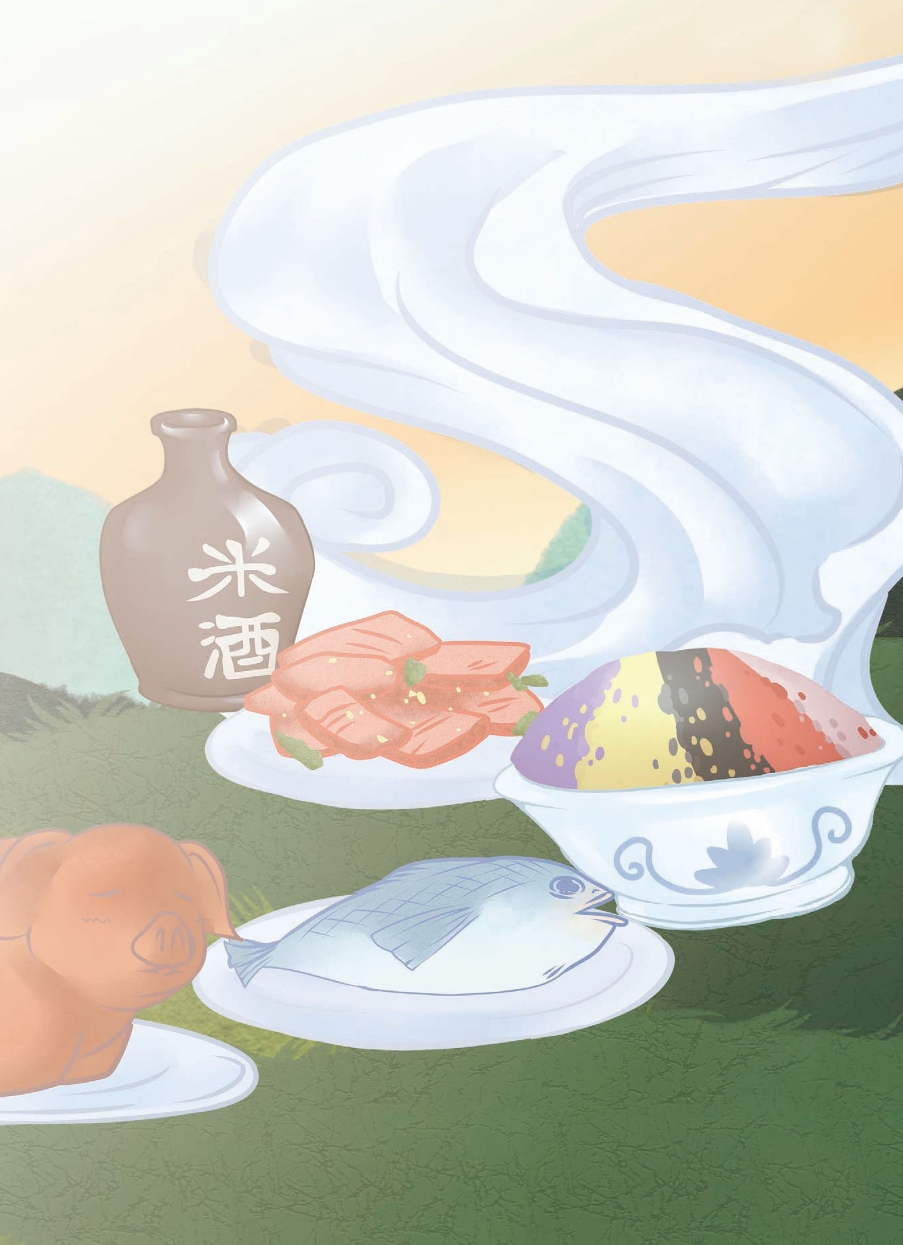 祭祀完毕,有些壮族地区有祭祀者共同分享祭品的习俗。人们认为在坟地旁与祖先共同进食是神圣的,也有拜祭之后拿祭品到家中再加热食用的。他们把祭品当作是人与神之间相通的媒介,认为食用祭品可以得到神灵祖先的护佑。祭品因为担当献祭的角色,包含的意义超出一般的食品,具有神圣的性质。