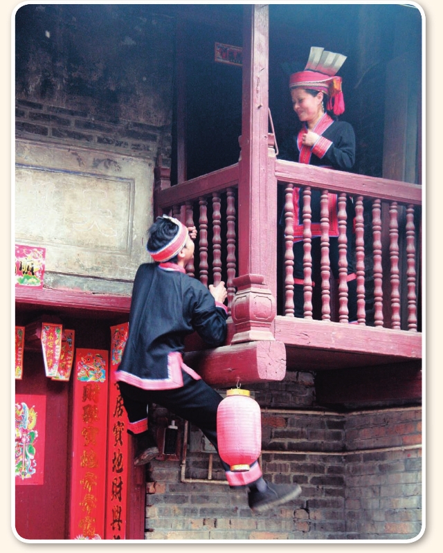 “爬楼”是金秀县茶山瑶男女青年的一种独特的恋爱方式。茶山瑶房屋分为上下两层结构,大门口左侧或右侧设有类似阳台的吊楼,紧靠吊楼内侧的小门里是房间,未婚女子大都住在此处。这是父母特意安排的。这个房间既是姑娘与情人相会的地方,也是姑娘绣花织锦的处所。当小伙子要找姑娘谈情说爱时,不是从大门进去,而是从门外爬上吊楼,如果姑娘同意,便会打开房门,让爬楼者上楼相会。如果姑娘不中意,便会将一盆水当头泼下!