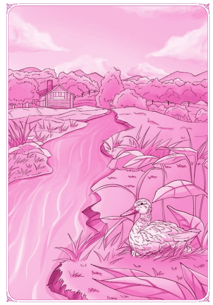乡下真是非常美丽!这时正值夏天,小麦是金黄的,燕麦是绿油油的。干草在绿色的牧场上堆成垛,鹳鸟用他又长又红的腿在散着步,噜苏地讲着埃及话,这是他从妈妈那儿学到的一种语言。田野和牧场的周围有些大森林,森林里有些很深的池塘。的确,乡间是非常美丽的,太阳光正照着一幢老式的房子,房子周围流着几条很深的小溪。从墙角那儿一直到水里,全盖满了牛蒡的大叶子。最大的叶子长得非常高,小孩子简直可以直着腰站在下面,像在最浓密的森林里一样。这儿也是很荒凉的。这儿有一只母鸭坐在窠里,她得把她的几个小鸭子都孵出来。不过这时她已经累坏了,很少有客人来看她。别的鸭子都愿意在溪流里游来游去,而不愿意跑到牛蒡下面来和她聊天。