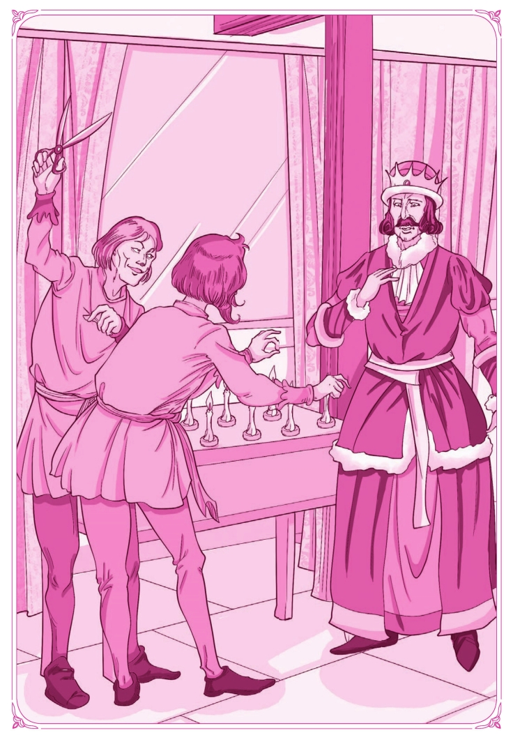 第二天早晨,游行大典就要举行了。在头天晚上,这两个骗子整夜不睡,点起16支蜡烛。你可以看到他们是在赶夜工,要完成皇帝的新衣。他们装作把布料从织机上取下来。他们用两把大剪刀在空中裁了一阵子,同时又用没有穿线的针缝了一通。最后,他们齐声说:“请看!新衣服缝好了!”