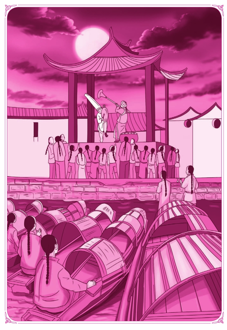 我还记得自己坐在这一种戏台下的船上的情形,看客的心情和普通是两样的。平常愈夜深愈懒散,这时却愈起劲。他所戴的纸糊的高帽子,本来是挂在台角上的,这时预先拿进去了;一种特别乐器,也准备使劲地吹。这乐器好像喇叭,细而长,可有七八尺,大约是鬼物所爱听的罢,和鬼无关的时候就不用;吹起来,Nhatu,nhatu,nhatututuu地响,所以我们叫它“目连嗐头”。