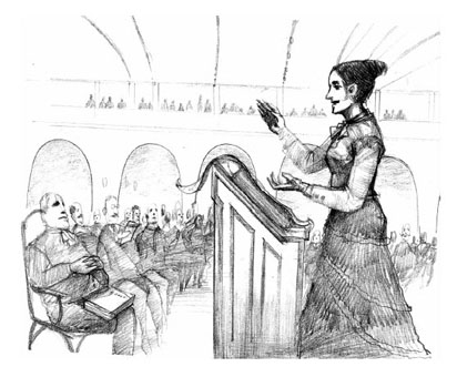 老居里大夫、皮埃尔·居里和布罗妮娅也坐在教室后面,与旁听的学生们挤在一处。在他们附近有一群叽叽喳喳的年轻女孩子,她们是赛弗尔学校的女生,来这里为的是给她们的老师喝彩。