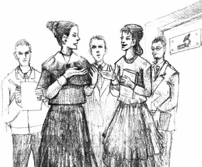 从她身旁经过的人都会停下来跟她打招呼。这个苏维埃群体在扩大。玛丽最后坐在楼梯台阶上,继续这种非正式的咨询。她坐在那里,仰起头看着站在自己身边或倚墙站立的工作人员,全然没有当领导的姿态。然而却在领导着全局!