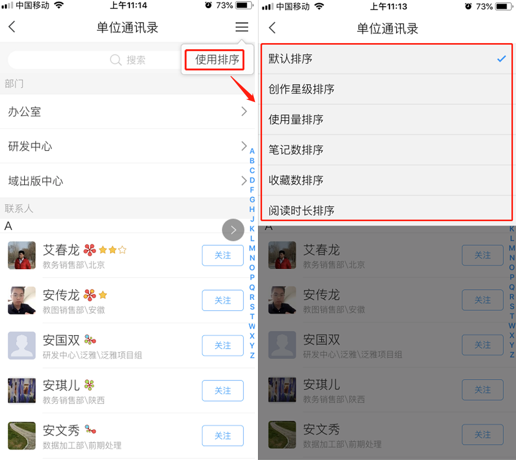 2、点击“单位通讯录“右上角三横,可选择按使用记录对人员进行排序,主要从创作星级、使用量、笔记数、收藏数、阅读时长五个维度划分。