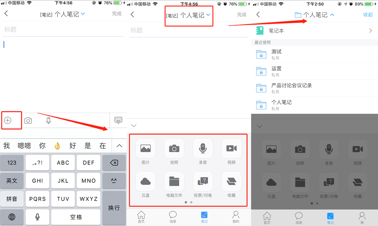 点击下方加号可以给自己的笔记添加图片,拍照、录音、添加云盘文件、添加视频、电脑实时传送文件、投票、添加自己收藏的资料、红包等等,来完善自己的笔记。