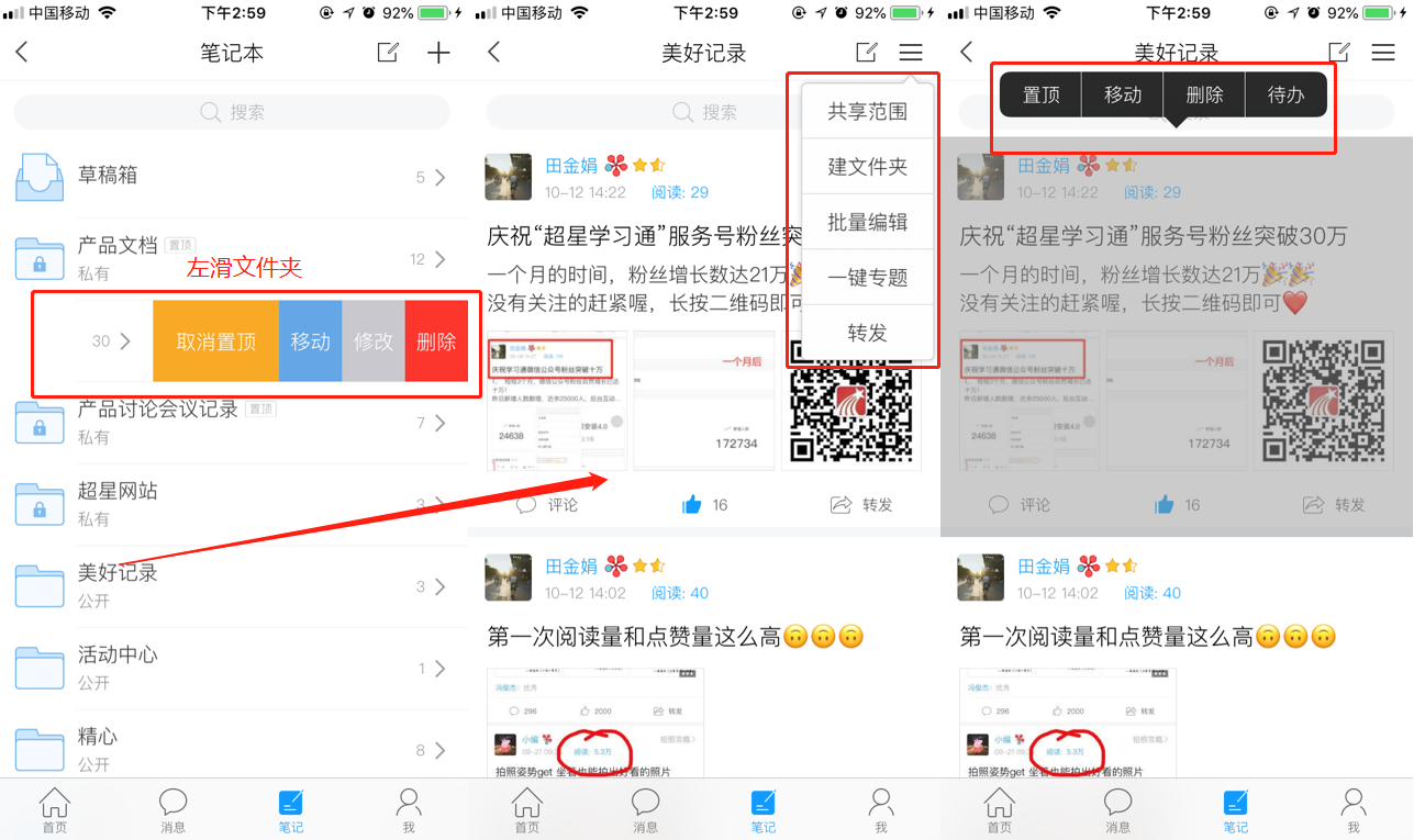 长按笔记可以对笔记进行置顶、移动、删除的处理。