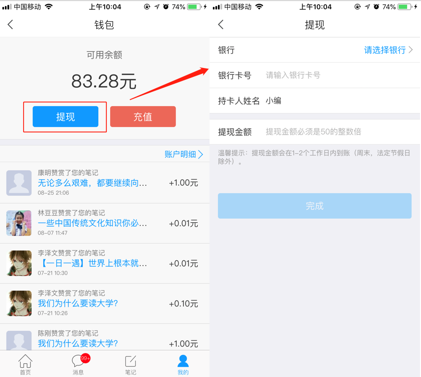 2、提现。点击"提现”,选择提现的银行,输入银行卡号、持卡人姓名、提现金额,点击完成。