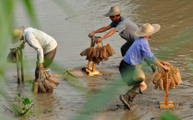 虎山村今年已90岁高龄的黄长九老人的家中至今还存放着一套早期的装泥鱼工具,由他的祖父在民国20年(1931年)传下来,已经见证了五代人装泥鱼的历史。黄长九老人自幼便跟随家人外出捕鱼,熟悉装泥鱼的整套工序,传承人黄炎兴的技艺便是得自于他的亲传。后来在长期的滩涂劳作中,村民们还用土制黄麻布缝制了类似雨靴的多层底蚝袜,以保护村民的双脚不被滩涂上的蚝壳割伤。从织泥鱼笼到织鱼篓、做泥板、制蚝袜、捕泥鱼,整套装泥鱼习俗传统手工技艺代代相传,一直延续到今天。