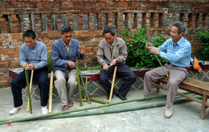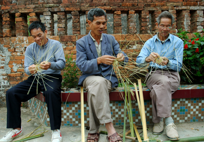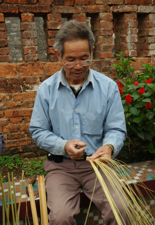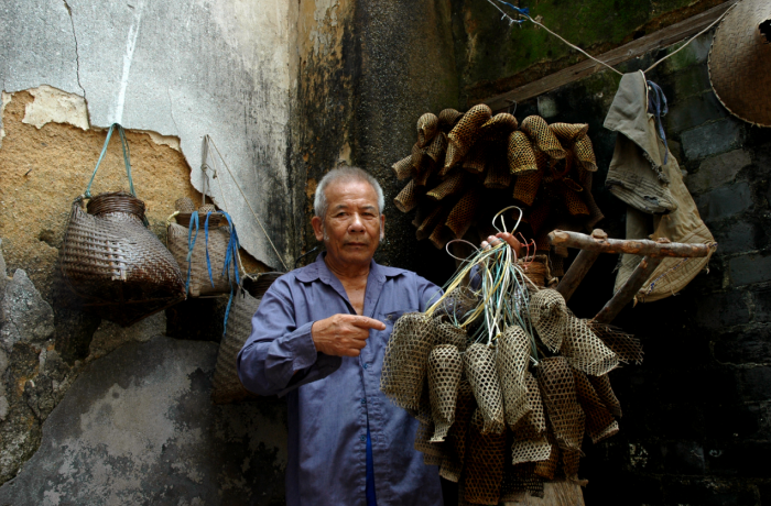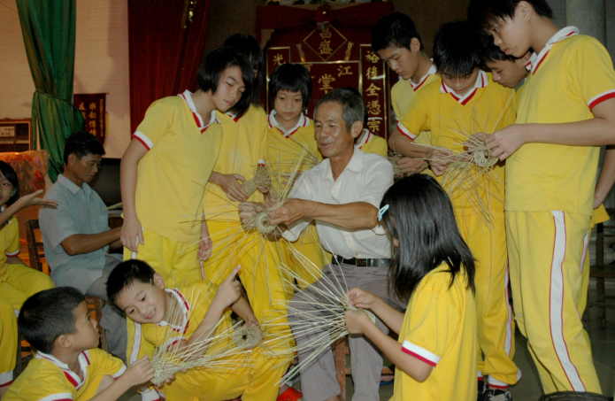 9.装泥鱼代表性传承人黄炎兴向乾务镇下一代传授编织泥鱼笼技术。