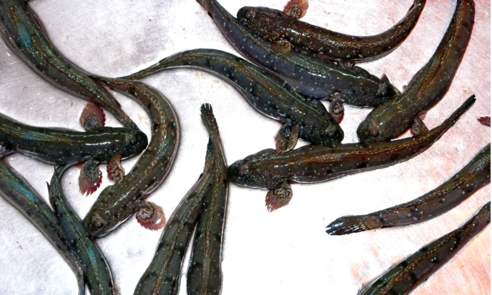 1、图为泥鱼。泥鱼,也叫花鱼,与泥鳅科类近缘,但外形和习性又不相同。身体圆柱形,尾端略小, 头大鳃鼓,鳞小而少,全身灰黑色,有花斑点,故亦称“花鱼”,生活在咸淡水交界的河湖滩涂地带,水域要求咸度在5‰左右,藏身于泥洞中,以藻类植物和腐植质为主要食物。