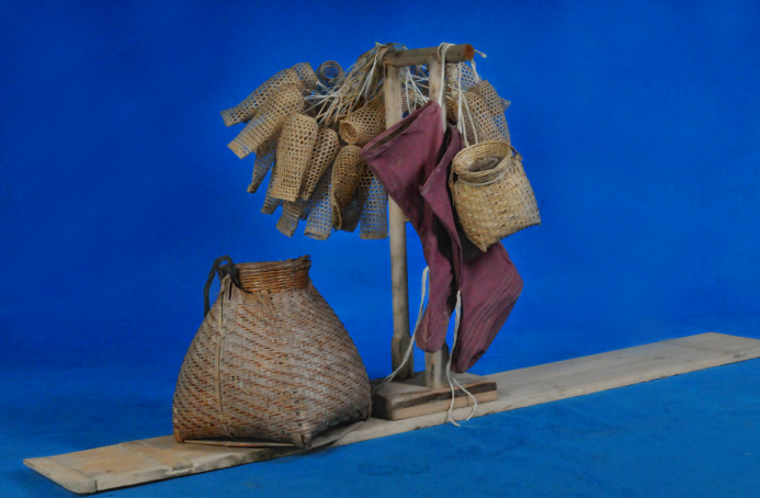 2、图为装泥鱼习俗的部分工具,主要包括泥鱼篓(行工和座工)、泥鱼笼、泥鱼板、蚝袜。