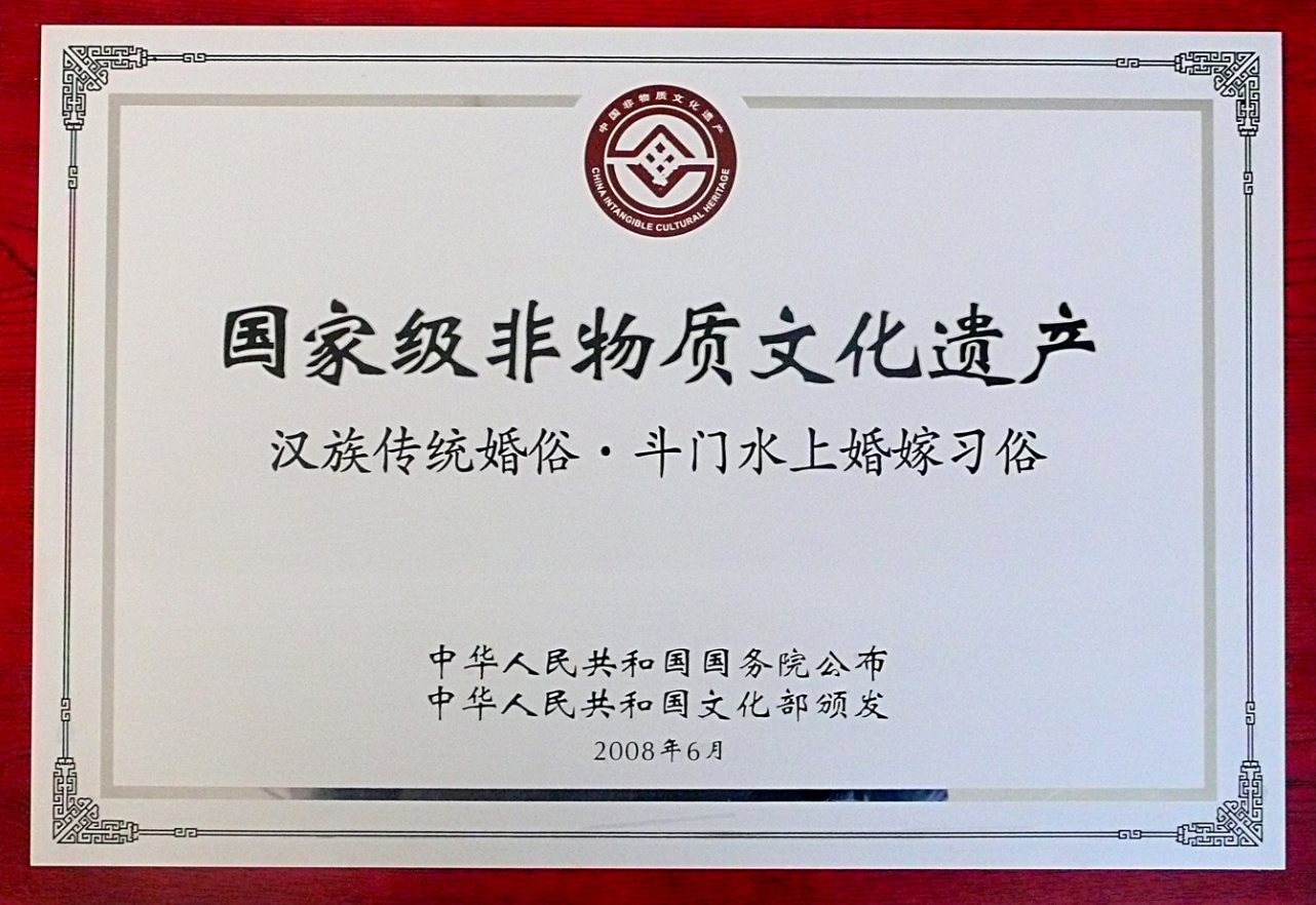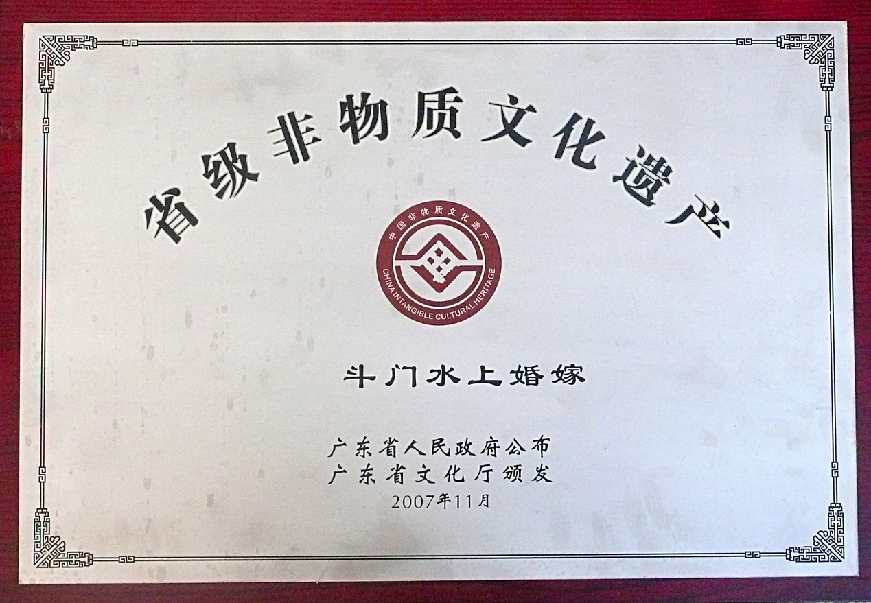 斗门水乡,有一种流行了几百年的民俗——水上婚嫁。经过几百年的沧桑变化和数代人的融合、沉淀,形成了斗门水乡特有的民俗,其主要特征是:一是婚嫁过程形式繁复多样,讲究礼仪,有着比较固定的程序和约定俗成的礼仪物品。礼仪主要有 “坐高堂”、“上头”、“叹家姐”、“花船迎亲”、“拜堂”、“回门”等。二是与居住的水环境不可分离,有明显“水”的特征。如“花船迎亲”,向“船太公”、“海龙王”敬拜等。三是与沙田民歌有不可分离的联系。