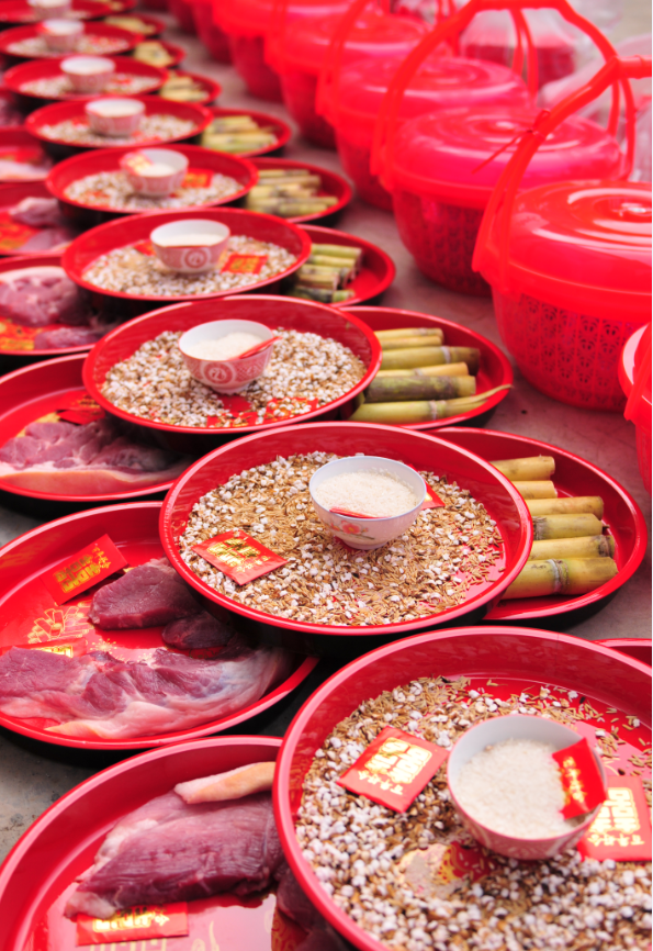 茶叶、糖果、礼饼、芝麻、酒、槟榔、绿豆、(定婚用食品);腌酸姜、红枣、鸡蛋、两对椰子、猪肉、三鸟(接亲用食品);甘蔗、一窝雏鸡(回门用品)等。
