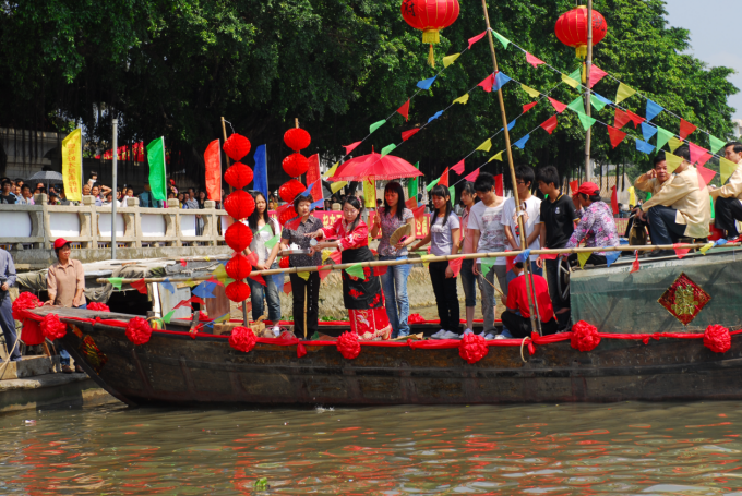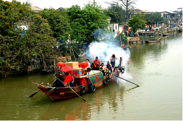 5.迎亲:接了新娘,迎亲船放起鞭炮,敲锣打鼓,一路唱起咸水歌向新郎家欢快地驶去……