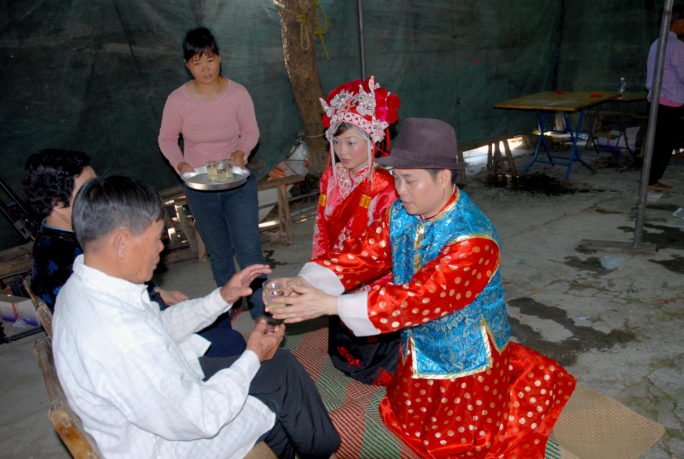 6.跪拜父母:新娘被迎进夫家门,走进竹棚,跨过火盆,拜过祖宗,夫妻双双手执鸡蛋甜茶,跪拜父母,感谢父母养育之恩。从此长大成人,孝敬父母,养儿育女,过上幸福美满的生活。