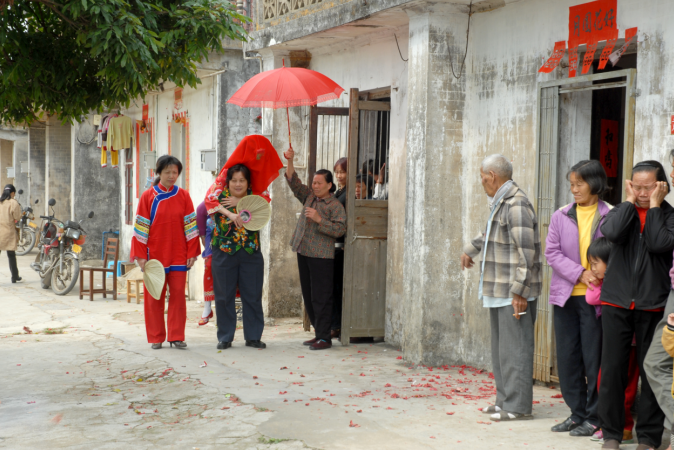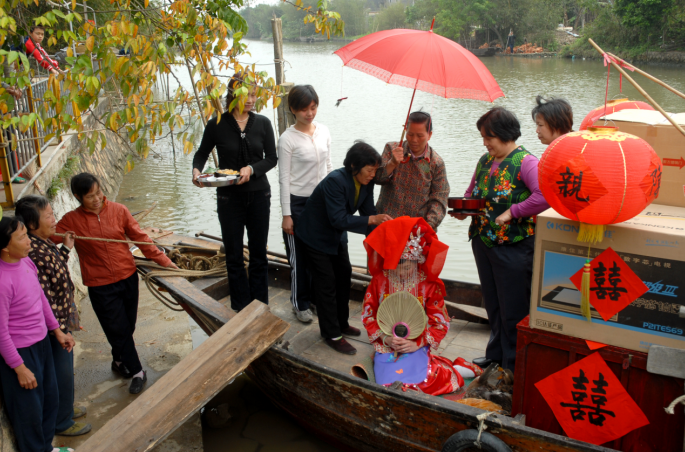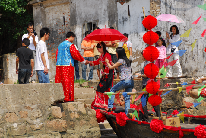 4.出嫁:新娘穿起新衣,围起一条象征吉祥的围裙,身披一条红布条,手拿一面镜子和一把扇,由大嫂背起,向接亲船走去。