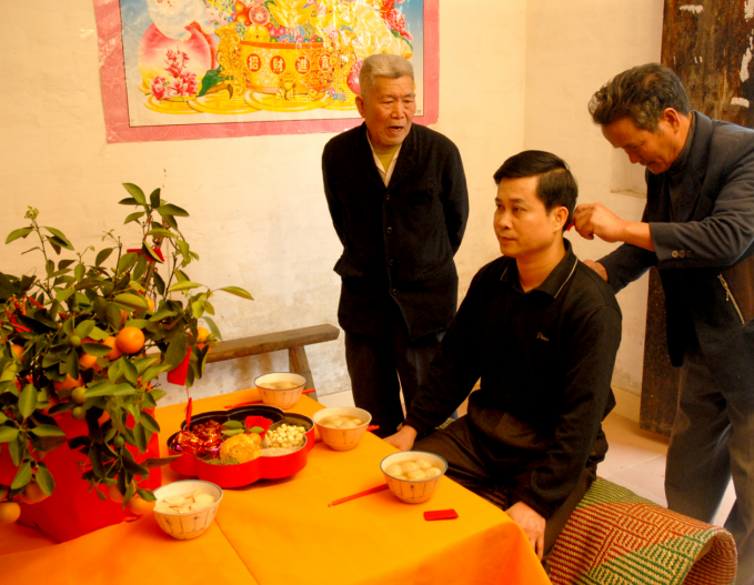 2.“梳头”:婚礼的前一天,男方家中摆张八仙桌,新郎席地而坐,由两位好命的男性长辈当梳头公,为新郎梳头,寓意新郎新娘婚后夫妻和睦,子孙兴旺。