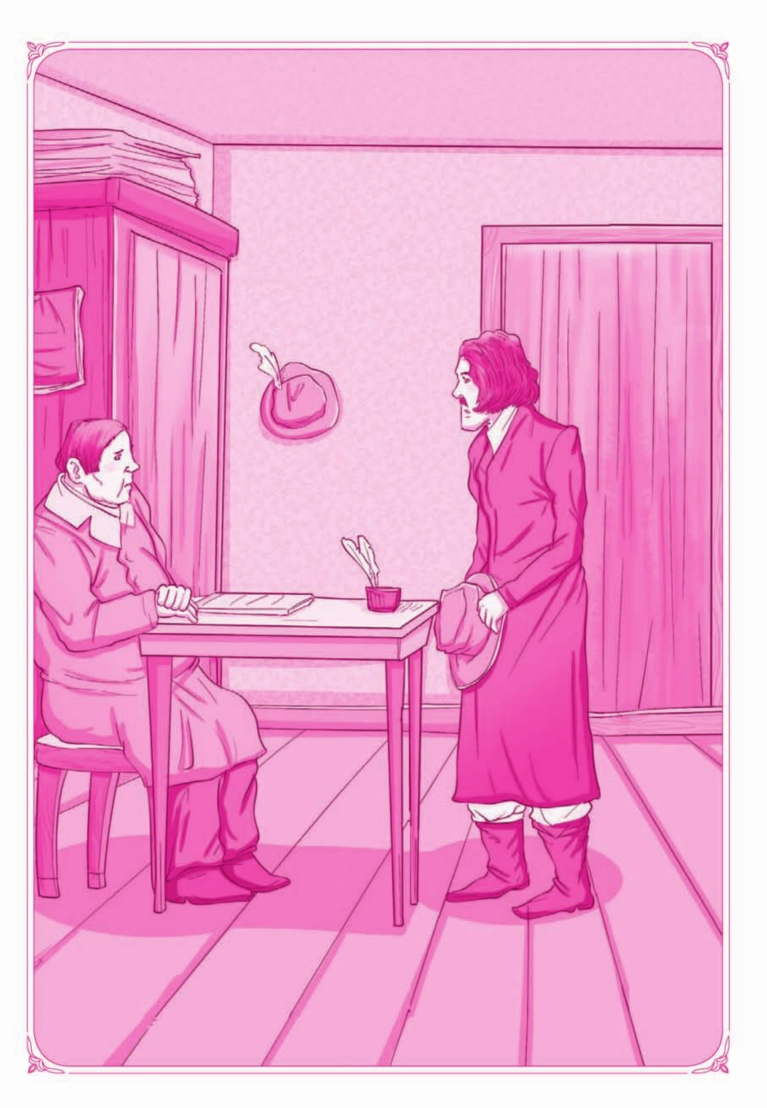 忽然街上传来一片喊声:“库普略!库普略!库普略惹不得了!”这喊声迫近台阶上来,过了不久,事务所里走进一个人来,这人身材矮小,样子像有肺病似的,他的鼻子特别长,一双大眼睛呆滞不动,神态非常高傲。他穿着一件绵绒领子的、纽扣极小的破旧的常礼服。他肩上背着一捆柴。他的周围聚集着五六个仆人,大家嚷着:“库普略!库普略惹不起了!库普略当伙夫了!”但是,穿绵绒领礼服的人并不注意他的同伴们的喧哗吵闹,脸色丝毫不变。他踏着整齐的步子走到炉子边,卸下肩上的重物,抬起身子,从后面的袋里取出一只鼻烟匣来,睁大了眼睛,开始把搀灰的草木樨末塞进鼻子里去。