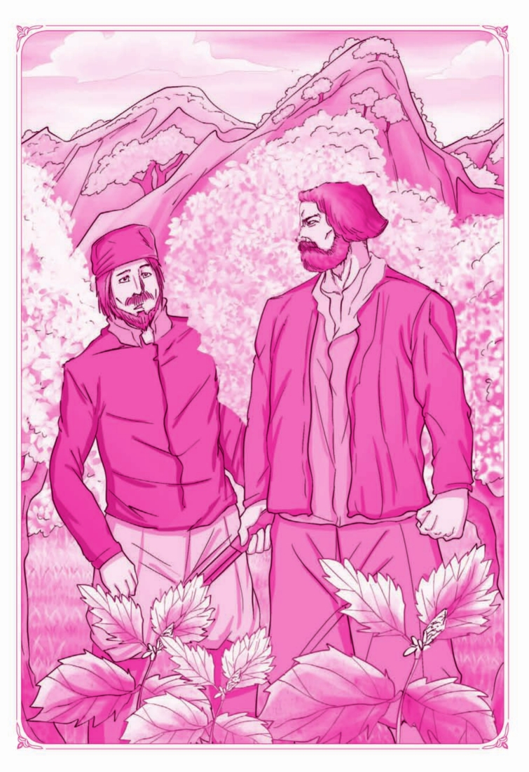 我望望他。这样强壮的汉子是难得看到的。他身材高大,肩膀宽阔,体格匀称。湿透了的麻布衬衫下面显著地露出他的强壮的肌肉来。鬈曲的黑须髯遮住了他的严肃而刚毅的脸的一半;一双连接的阔眉毛底下,露着一对炯炯有神的褐色的小眼睛。他把一双手轻轻地叉在腰里,站在我面前了。