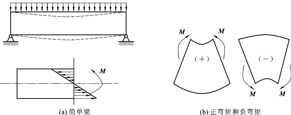 杆件截面上法向分布的正应力对截面形心的力矩之和称为弯矩。在建筑工程中,只要荷载方向与杆件轴线不共线,杆件截面上必然会产生弯矩。如图1-8(a)所示,简单梁在梁和楼板的自重、楼板上荷载的作用下,梁将发生竖向弯曲变形,其轴线以上截面受压应力,轴线以下截面受拉应力(见图1-9(a)),上下截面应力对截面形心的力矩之和即为该截面上的弯矩值。