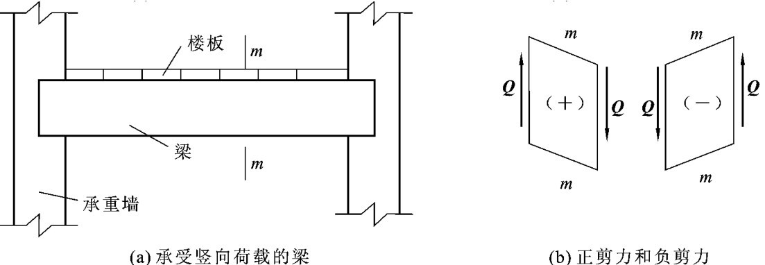 杆件截面上垂直于截面法线方向上分布内力的合力,称为剪力。在建筑工程中,产生剪力最为常见的构件是承受竖向荷载的梁,如图1-8(a)所示。