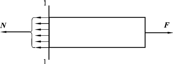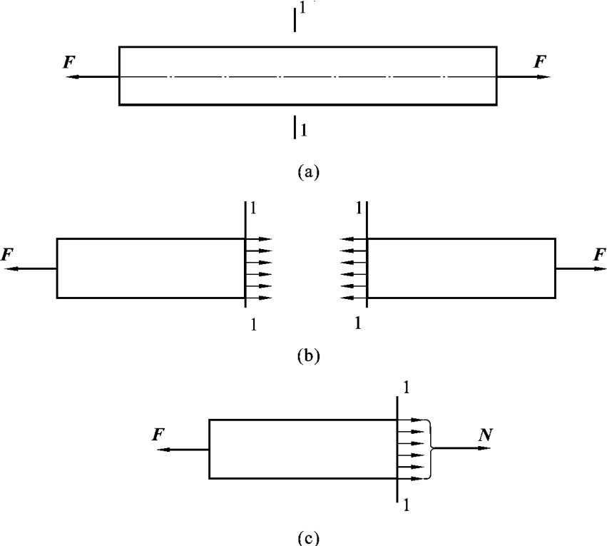 如图1-3(a)所示,在杆件轴线方向上,两端受拉力F作用处于静止平衡状态,要计算拉杆截面1—1上的内力,可以假想用一截面将杆件在1—1处截开,如图1-3(b)所示。选截面的左半段进行研究,如图1-3(c)所示,左段受到外力F的作用,由于右段杆件的制约作用,左段杆件仍保持平衡,根据平衡条件,截面1—1上的内力应该和F平衡,所以轴向拉(压)杆截面上的内力其作用方向是通过截面形心并与截面垂直,和杆件轴线重合,用N表示。由水平方向平衡条件可得