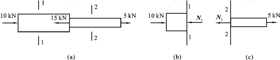 由于截面1—1和截面2—2是任意选择的截面,所以用截面法可求出杆件任意截面上的内力。据此很容易得出,构件中粗的杆件各截面上的内力都等于10kN,细的杆件各截面上的内力都等于5kN。