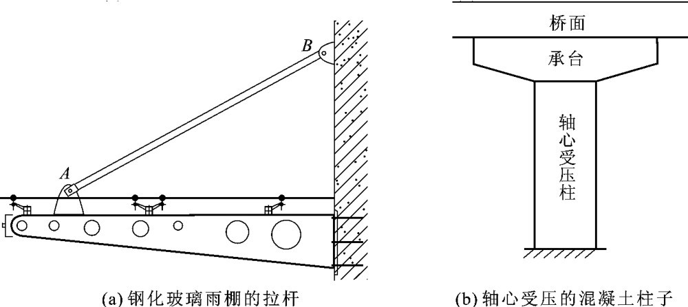 杆件截面上垂直于截面,与杆件轴线重合的内力称为轴力。在建筑工程中,许多构件只承受拉力或压力的作用,如钢化玻璃雨棚的拉杆AB(见图1-6(a)),轴心受压的混凝土柱子(见图1-6(b))。这类杆件的受力特点是杆件承受外力的作用线与杆件轴线重合;变形特点是杆件沿轴线方向伸长或缩短。