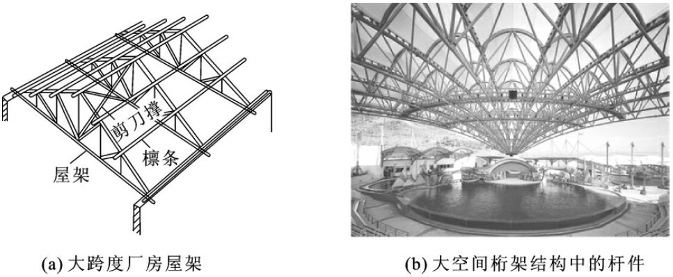 如图1-16(a)、(b)所示,在一对方向相反,作用线与轴线重合的外力作用下,杆件发生沿轴线方向的伸长或缩短,这种变形形式称为轴向拉伸或压缩。在房屋建筑工程中,构件沿着轴线方向拉伸或压缩形成单一变形的情况较少,但以拉伸或压缩为主的变形构件还是存在的,比如大跨度厂房屋架、大空间桁架结构中的杆件等,如图1-17所示。