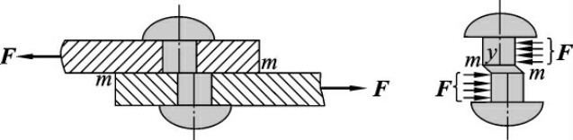 在一对相距很近,方向相反,作用线与轴线垂直的外力作用下,杆件的截面沿外力作用方向发生错动,这种变形形式称为剪切,如图1-16(c)所示。工程中最常见的剪切变形发生在铆接用的铆钉上(见图1-18)。
