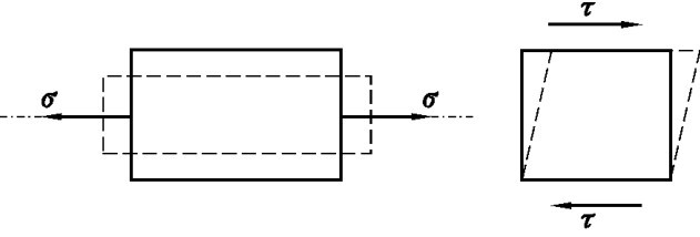 与点的正应力和切应力(见图1-21)相对应,应变分为线应变和角应变。构件在正应力作用下边长发生改变,其变形量称为线应变(ε);在切应力作用下,两棱边的夹角发生改变,其改变量称为角应变(γ),用弧度来度量。当外力卸除后,物体内部产生的应变能够全部恢复到原来状态的,称为弹性应变;如只能部分恢复到原来状态的,其残留下来的那一部分称为塑性应变。