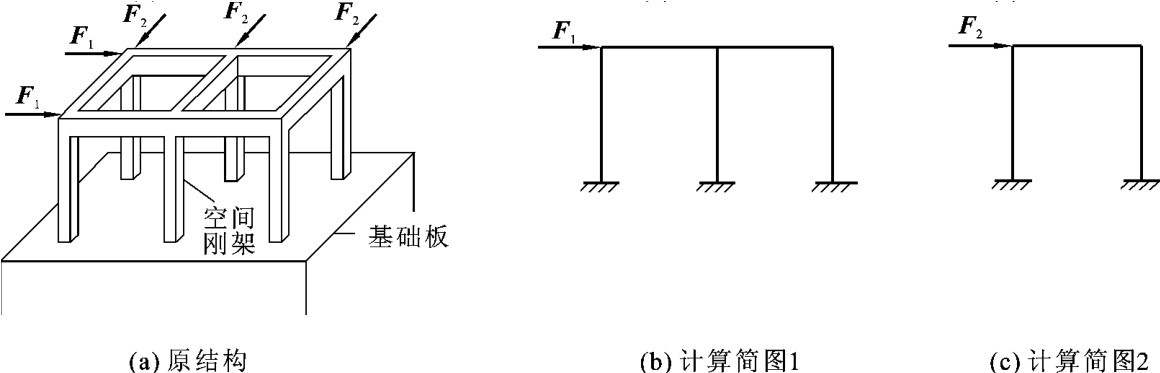 如图2-13(a)所示的钢筋混凝土空间刚架,在图示荷载作用下,就可以简化成为图2-13(b)、(c)所示的两个方向的平面刚架来计算。如何选择合理的结构计算简图对一些常见结构形式进行受力分析,是工程中常见的问题。