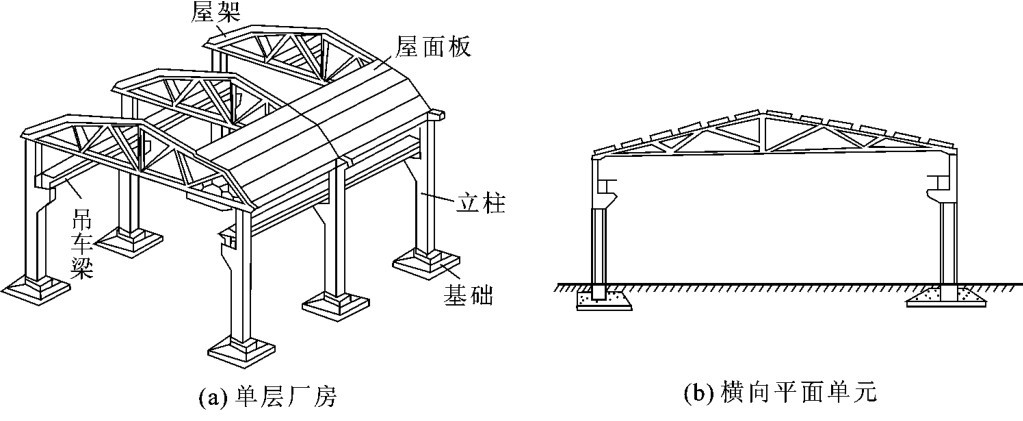 该单层厂房是由许多横向平面单元(见图2-25(b))通过屋面板和吊车梁等纵向构件联系起来的空间结构。由于各个横向平面单元相同,且作用于结构上的荷载一般又是沿厂房纵向均匀分布的,因此作用于结构上的荷载可通过纵向构件分配到各个横向平面单元上。这样就可不考虑结构整体的空间作用,把一个空间结构简化为若干个彼此独立的平面结构来进行分析、计算。