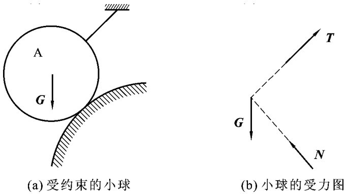 【例2-4】 重力为G的小球A由光滑曲面及绳子支承来约束,如图2-26(a)所示。试画出小球A的受力图。