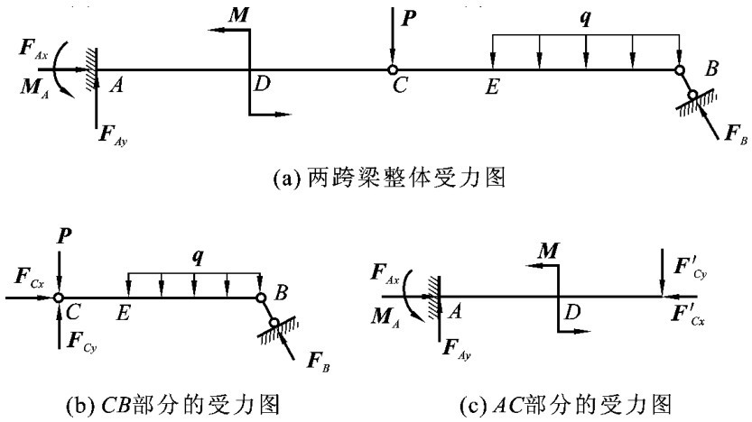 【例2-7】 试画出如图2-29(a)所示两跨梁整体受力图、CB部分的受力图以及AC部分的受力图。